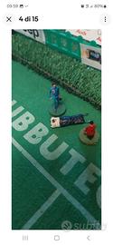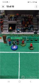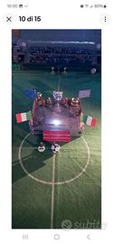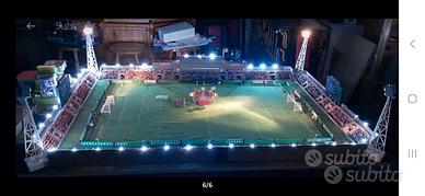 vendo stadio subbuteo,con tribune in legno compensato fatte a mano,con attualmente varie pubblicità, luci a led e 4 fari laterali originali, panchine, Var,arbitri, tabelloni segnapunti con squadre varie,raccatta palle, steward, osservatori, barellieri, ferito in barella, dottore,giardiniere, spazzino con bidoniindifferenziata,venditore di arrosticini, palloni,porte,attrezzi per allenamento, pompieri, banda musicale, palco per la premiazione, cameramen, giornalisti, polizia, 400/500 tifosi incollati e altro ancora....dimensioni piano in legno attualmente 175x125cm....disponibili altre foto, spedito smontato senza tavolo con un costo aggiuntivo di €30