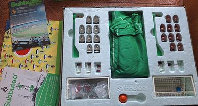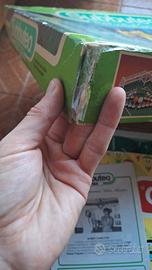 Subbuteo originale “Club Edition”, 1985-86. Confezione originale del gioco Subbuteo, The Football Game. Scatola esterna in cartone danneggiata, ma gioco interno completo (contenuto visibile). Grafica verde, struttura in polistirolo interna, 2 squadre complete (11 + 11 giocatori), portiere su asta di riserva, pallina arancione, campo in tessuto sintetico originale e marcato Subbuteo, bandierine del calcio d’angolo, istruzioni e poster con elenco squadre (edizione italiana, anni ’80), personaggi di riserva e spettatori. Prezzo trattabile