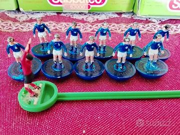 Subbuteo - lotto materiale da recupero: - box con ref originale Real Madrid/Bredford City ref. 21 senza vetrinetta - vassoio di polistirolo - box senza ref e con vetrinetta staccata da un lato - 10 giocatori integri ridipinti - 1 portiere incollato