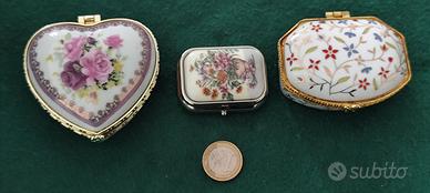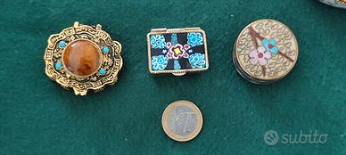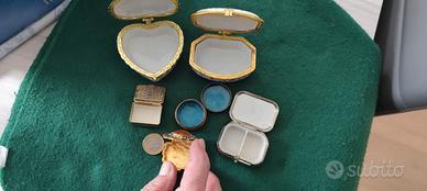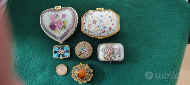 Causa dismissione collezione, a soli 25,00 euro complessivi (ovviamente NON TRATTABILI), cedo 6 carinissime scatoline portapillole cloisonné vintage (anni '80) ognuna di diverso stile, foggia e misura. Anche i materiali impiegati si differenziano (ceramica dipinta, ottone con lacca, pietra etc.).