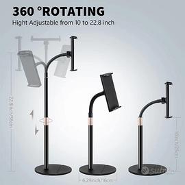 ?Rotazione di 360° e Altezza Regolabile?Il supporto per tablet supporta la rotazione di 360°, il collo d'oca interamente in metallo può essere facilmente regolato e allungato e l'altezza può essere regolata da 10 a 22.8 pollici per adattarsi a qualsiasi postura di visualizzazione. Libera le mani e allevia il dolore al collo quando si è sdraiati supino o supino per rilassarsi. È molto adatto per guardare video, leggere, dipingere, yoga, lezioni, trasmissioni in diretta, interazione multischermo, ecc.