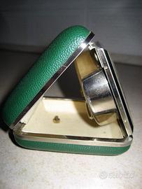 Sveglia da viaggio/comodino anni 80 - movimento meccanico con funzione di segnatempo e sveglia dimensioni ( cm 7,5x7,5x3 ) ; involucro in materiale plastico stampato goffrato antiscivolo ; movimento e cornice in metallo cromato , il marchio è EUROPA ( ma potrebbe essere Veglia o Jungans o altri 100 poichè il costruttore è sempre lo stesso ) ; in ottime condizioni estetiche e funzionali - Poiche sono anni che non è in funzione occorre procedere al lavaggio e lubrificazione del movimento altrimenti dopo pochi istanti di funzionamento si ferma E un'interessante base per coloro che amano provare a cimentarsi con i movimenti micromeccanici e fare esperienze Contattare Fausto anche in voce o whatsapp