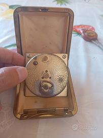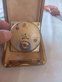Affascinante Sveglia Da Viaggio Vintage Europa (Germany), prodotta tra gli anni ’50 e ’70, con il classico design pieghevole in custodia rivestita in similpelle nera. Quadrante bianco con numeri arabi ben leggibili, movimento meccanico a carica manuale con suoneria funzionante.