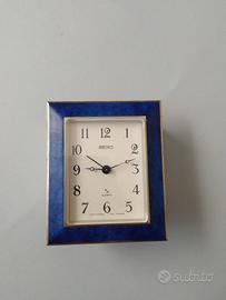 Sveglia SEIKO Quartz con cornice in smalto color lapislazzuolo, MOVT Japan DIAL France, funzionante sia l'orologio che la suoneria, realizzata in ottone satinato il quadrante compresa la cornice, misura 7 cm x 9 cm e pesa 213 g.