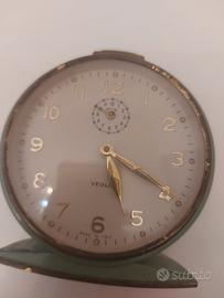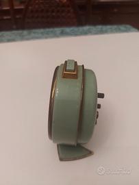 Sveglia a carica manuale marca Veglia, design anni ’60/’70, colore verde salvia, numeri dorati e elegante base d’appoggio. Funzionante, con segni normali di usura tipici dell’epoca.