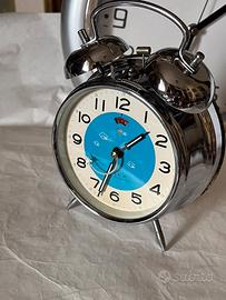 Sveglia classica a doppia campana prodotta dalla GOLDEN COCK di tijanin in Cina(gallo dorato,qui argentato nel logo sul quadrante)nel febbraio 1974,piu’ di 50 anni fa!.Sul quadrante in cartoncino stampato bicolore di 10 cm in diametro gira un aereo a reazione(lancetta dei secondi modificata)che attraversa il cielo:tipico della Cina di quegli anni (rivoluzione culturale-industriale di Mao)esaltare il progresso tecnologico anche attraverso un comune oggetto.Cromature della scocca e dei campanelli ottime mentre la doratura del retro è’ vissuta.Movimento interno interamente in acciaio ed ottone che concorre al buon peso dell'oggetto(400 grammi)Altezza 17 cm,diametro retro 12 cm.Ben funzionante,acquisto as is visto e piaciuto come sempre.In altra inserzione altra unità’ del 1976 ,stesso modello