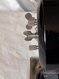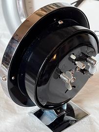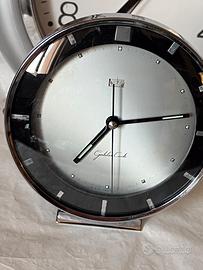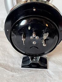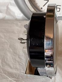 Sveglia prodotta a Tijanin vicino a Shanghai dalla nota casa cinese golden cock(oggi seagull)nel gennaio del 1967 come da data riportata sul movimento secondo la numerazione di qs casa.Grandissimo quadrante,(12,5cm)ricoperto da vero vetro bombato,color argento satinato su cui spiccano le lunghe sfere,al di sotto del 12 c’è’ la classica finestrella indicante l’ora di allarme,mentre in basso in corsivo e con caratteri tipici dell’epoca il marchio per intero.Punti ora e lancette visibili al buio.Al posto di cifre stampate troviamo indici metalliciin varia grandezza inseriti su un anello periferico nero.Scocca e retro in metallo nero con vernice ben conservata senza ammanchi o ammaccature.Peso 500 grammi,altezza 13,5.Orologio molto elegante minimalista.Ben funzionante,acquisto as is visto e piaciuto.prezzo non trattabile!
