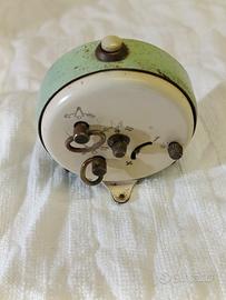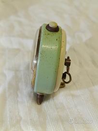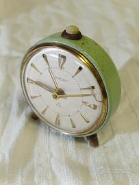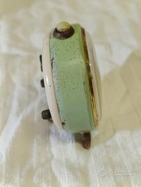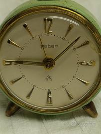 sveglia vintage a carica manuale, caratterizzata da una scocca in metallo di colore verde acqua o menta e un quadrante bianco con indici e lancette dorate. Dettagli dell'Oggetto l'orologio presenta le seguenti caratteristiche: Marca: Sul quadrante è visibile il logo "Peter". Origine: La scritta "Germany" alla base del quadrante indica che è stata prodotta in Germania. Periodo: Il design è tipico degli anni '50 o '60, un'epoca in cui le sveglie meccaniche da tavolo con finiture dorate e colori pastello erano molto diffuse. Caratteristiche Visive: Presenta numeri arabi ai punti cardinali (12, 3, 6, 9) in stile rilievo dorato, lancette a lancia (dauphine) e piccoli punti luminescenti per la visione notturna. Scocca esterna: In metallo (probabilmente acciaio o ottone) verniciato in un color verde acqua pastello. Presenta segni di ossidazione e usura della vernice sui bordi superiori, tipici degli oggetti vintage. Cornice e indici: In metallo dorato (ottone o metallo galvanizzato). Le lancette e i numeri in rilievo hanno la stessa finitura. Copertura del quadrante: materiale plastico trasparente (es. esalite/plexiglass), comune nelle produzioni degli anni '50 e '60 Piedini e pulsante: In metallo brunito per la base e materiale plastico o bachelite per il tasto superiore della suoneria