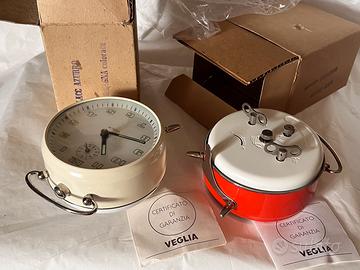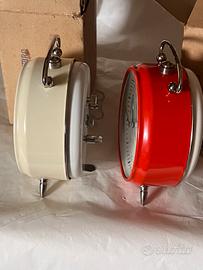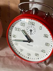 Ultima unità’ bicolore rossa-bianca .Monta un movimento di tutto rispetto in ottone ed acciaio made in Germany e rappresenta le ultime produzione col marchio Veglia di sveglie meccaniche in un periodo in cui si stava affermando il quarzo (a pila.)e’ corredate da talloncino di garanzia e dal box originale in cartone doppio strato.Ore (cifre ) e lancette fluorescenti al buio;il quadrante ha un diametro di 8,5 cm,l’altezza della sveglia e’ di 11,5 cm.Peso 340 grammi.
