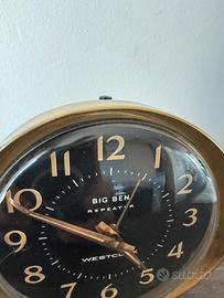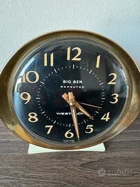 Vendo sveglia vintage Westclox Big Ben Repeater prodotta in Scozia negli anni '70. Perfettamete funzionante e in ottimo stato. Sveglia meccanica a carica manuale con funzione "repeater" (allarme ripetuto). Presenta un quadrante nero con numeri dorati, cassa in metallo dorato e una base color crema. Oggetti simili sono ricercati sia come pezzi decorativi che per componenti di ricambio. Le lancette e i numeri contengono vernice luminescente al radio, tipica degli orologi di quell'epoca. Misure: altezza cm. 12,5 - larghezza cm. 12,5 - spessore cm. 6. Preferibile ritiro o consegna diretta. Eventuali spese di spedizione a carico dell’acquirente. No perditempo.