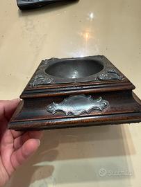 Svuota tasche vintage da tavolo con inserto in peltro e base in legno Stile Art Nouveau: presenta decorazioni floreali in rilievo e dettagli ornamentali che richiamano lo stile di fine XIX e inizio XX secolo.