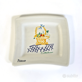 Questo oggetto è un complemento d'arredo funzionale (svuotatasche o vassoio da scrivania) di forma rettangolare, prodotto dall'azienda italiana Tognana su licenza ufficiale della Succession Picasso e distribuito nei primi anni 2000. Soggetto: Riproduce l'opera grafica "L'Horloge de Fleurs" (L'orologio di fiori) del 1961. Funzioni: Utilizzato come vassoio per piccoli oggetti (chiavi, monete, gioielli) o come elemento puramente decorativo da esposizione. Dettagli di Finitura: Realizzato in porcellana bianca con stampa serigrafica con una grande vivacità cromatica (toni di giallo, rosso e blu). Presenta la firma "Picasso" sul bordo frontale e il marchio completo della licenza sul retro.