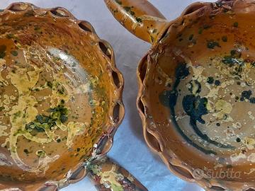 Svuotatasche o tegami ornamentali in terracotta smaltata Ceramiche San Marco, dall'insolito bordo con asole, lavorato e dipinto a mano nei colori classici delle terrecotte inizio secolo italiane, Non ci sono difetti o danni, possono riportare segni del tempo, diam 23,5larghezza latomanico 34 , altezza8 cmpeso 1150 gr cad