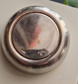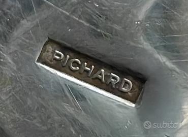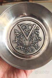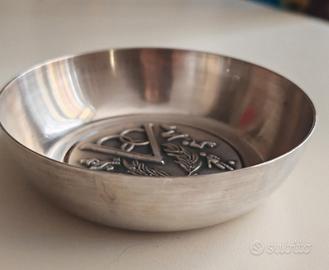 Svuotatasche d'Epoca Pichard-Balme – Tema Sportivo Elegante svuotatasche circolare in metallo argentato, realizzato dalla storica e prestigiosa casa francese Pichard-Balme. Questo oggetto non è solo un pratico svuotatasche, ma una pregiata opera di micro-scultura che celebra l'eccellenza atletica. Dettagli della Raffigurazione Il pezzo è caratterizzato da una splendida raffigurazione sportiva in rilievo sul fondo, eseguita con la maestria tipica dei maestri incisori di medaglie. Il dinamismo delle figure e la precisione del tratto rendono omaggio al gesto sportivo, conferendo all'oggetto un carattere celebrativo e solenne. Specifiche Tecniche Manifattura: Pichard-Balme (Saumur, Francia). Materiale: Metallo argentato di alta qualità. Dimensioni: Diametro 11 cm | Altezza 3 cm. Soggetto: Scena sportiva in altorilievo. Condizioni: Ottime condizioni vintage, con una lucentezza che mette in risalto i dettagli della coniazione.