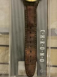 Cassa trasparente con dettagli dorati, quadrante iconico della serie Chrono e cinturino stile pelle.