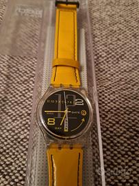 Orologio originale Swatch da collezione, cinturino in pelle laccata gialla movimento al quarzo quadrante nero con data e giorno con scatola originale
