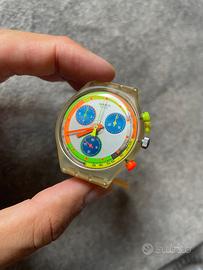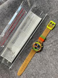 Swatch Jelly Stag, anno 1993, referenza SCK104 NOS, quindi nuovo, mai indossato. Perfettamente funzionante sia in modalità orario che in modalità cronografo, fornito di batteria nuova. Cassa e vetro in condizioni eccelse, nessun segno di usura. Cinturino perfetto, ancora indossabile e morbido. Vendo con scatola originale e certificato d’acquisto timbrato. Pezzo davvero molto raro, introvabile in queste condizioni