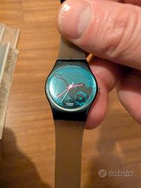 Swatch Lady LB108 "Velvet Underground" (anno 1985) con cinturino "jelly" trasparente e quadrante da 25mm con un motivo a rete nero e turchese. Con custodia originale e prova d'acquisto. NB. Il cinturino si è naturalmente opacizzato negli anni e sono presenti alcune piccole righe sul vetro (vedi ultima foto).