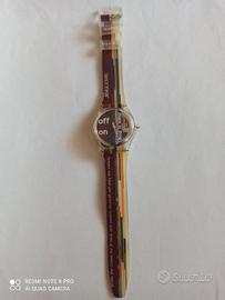 swatch musicall jingle meglio vintage. nella confezione originale. l'orologio è stato indossato (piccolo difetto nel retro del cinturi6, come da terza foto). batteria da sostituire.