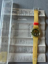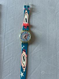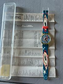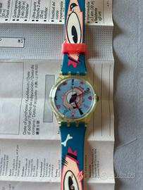 Swatch originale anni ’90, modello al quarzo con grafica pop-art su cinturino e quadrante, raffigurante volti stilizzati con occhi in primo piano. Mai indossato, in perfette condizioni, completo di scatola rigida trasparente e leaflet. Swiss Made, da testare con batteria nuova. Pezzo iconico per collezionisti amanti dello stile new wave.