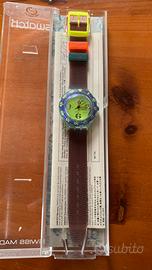 Un orologio che rappresenta perfettamente lo stile Swatch dell’epoca: colori forti, spirito sportivo e design sperimentale.