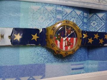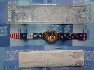 Orologio Swatch The American con custodia e garanzia 1993 Funzionante usato con cinturino consumato come da foto. Non effettuo spedizioni, solo ritiro in zona. L'oggetto è quello della foto, per altre foto o informazioni contattare.