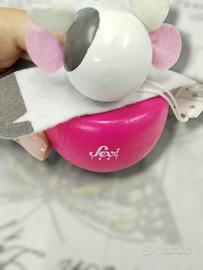 Mucca basculante in legno, un piccolo giocattolo decorativo o da scrivania. Il suo design, con una base semisferica, le permette di oscillare avanti e indietro se spinta, senza mai cadere.