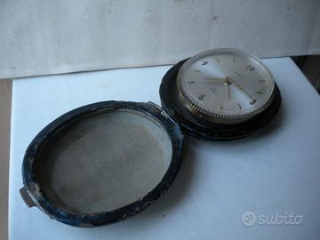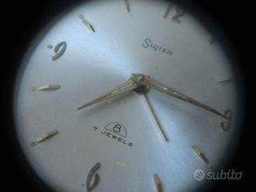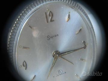 Swiza sveglia anni 50 meccanica carica manuale Swiss Made calibro 8 movimento carica 8 giorni con astuccio nero misura chiuso cm.9x7 movimento da controllare non funziona.Venduta non funzionante