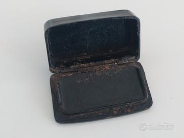 antica tabacchiera vittorianarealizzata incartapesta laccata(papier-mâché) o legno con finitura in lacca nera. Questo tipo di oggetti era molto diffuso nel XIX secolo per contenere tabacco da fiuto o da pipa.Risale tipicamente all'epoca vittoriana, circa tra il1820 e il 1860. Forma rettangolare con angoli arrotondati e un coperchio incernierato. 7,5 x 4 circa.