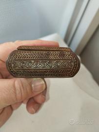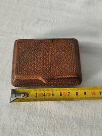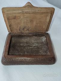 Vendo tabacchiera finemente lavorata , in legno con coperchio, prodotta durante la prigionia del soldato dell'Esercito Austro Ungarico "" GALIC Jovan "" nel campo di prigionia di Frinco d'Asti (AT) nel 1916 . Dim. lunghezza 9 cm larghezza 6 cm e spessore 3 cm. Segni di ruggine sulla cerniera d'unione . Spese a carico del destinatario.