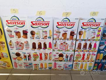 Da collezione privata casalinga vendo tabella tabelle insegna gelati torte PRESTIGE SANSON, SANSON, ALGIDA, TANARA, tenute in maniera superba, con normali segni di usura del tempo, misure 30x80...