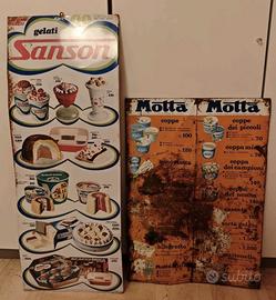 Tabella vintage anni 70 gelati Motta da 81 cm X 30 cm Euro 80. Coppia di Tabelle Sammontana anno 2017 da 95 cm X 40 cm Euro 25 al pezzo. Tabella vintage Gelati Sanson anno 1970 da 98 cm X 36 cm Euro 100. Tabella vintage Gelati Motta da 69 cm X 49 cm Euro 25. Preferibile il ritiro in negozio, per eventuali informazioni in merito, prezzi, o possibilità di spedizione, contatto telefonico al 3496282557.