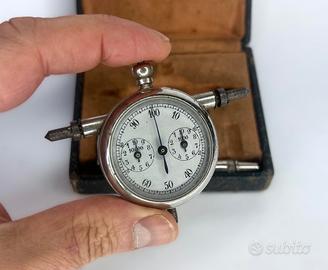 Tachimetro meccanico contagiri d’epoca primi ‘900 con custodia (funzionante) Serviva per misurare la velocità di rotazione (giri al minuto) di un albero o di una macchina. Era uno strumento molto usato in officine, industria e manutenzione prima dell’arrivo dei tachimetri digitali. Caratteristiche: - quadrante smaltato con numeri sottili - cassa in metallo lucido - set di punte intercambiabili in astuccio rivestito (NE MANCA UNA) - Periodo tra il 1900 e il 1930, prodotto probabilmente in Francia In ottime condizioni considerata l'età, custodia usurata ma integra, marchio non identificabile. Funzionante (anche se è difficile stabilirne la precisione). Tachymètre mécanique compte-tours ancien début XXe siècle avec étui (fonctionnel) Il servait à mesurer la vitesse de rotation (tours par minute) d’un arbre ou d’une machine. C’était un instrument très utilisé dans les ateliers, l’industrie et la maintenance avant l’arrivée des tachymètres numériques. Caractéristiques : cadran émaillé avec chiffres fins boîtier en métal poli jeu de pointes interchangeables dans un étui gainé (IL EN MANQUE UNE) période entre 1900 et 1930, probablement fabriqué en France En très bon état compte tenu de son âge, étui usé mais intact, marque non identifiable. Fonctionnel (même s’il est difficile d’en garantir la précision). Antique early 1900s mechanical tachometer (revolution counter) with case (working) It was used to measure the rotational speed (revolutions per minute) of a shaft or a machine. It was a widely used instrument in workshops, industry, and maintenance before the advent of digital tachometers. Features: enamel dial with fine numerals polished metal case set of interchangeable tips in a lined case (ONE IS MISSING) dating from between 1900 and 1930, probably made in France In very good condition considering its age, case worn but intact, brand not identifiable. Working (although its accuracy is difficult to determine).