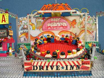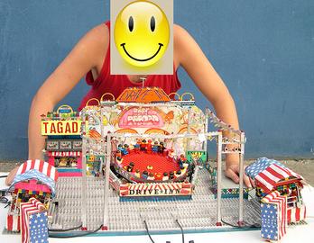 TAGADA Costruzione realizzata interamente in LEGO, modello unico, realizzazione fedele ed impeccabile di ogni dettaglio, tecnico costruttivo. Riproduzione impeccabile della giostra ( spettacoli viaggianti - luna park ) di nome: TAGADA ( tutt'ora esistente e funzionante, si può incontrare in diverse fiere d'Italia ), L'opera di dimensioni rilevanti, occupa un'area di un metro e trenta di larghezza per circa un sessanta centimetri di profondità, è perfettamente funzionante: esegue tutti i movimenti esattamente come la giostra reale, è munita di motori elettrici, di pistoni ad aria, di impianto luci a led. Questa magnifica ed incredibile costruzione è stata realizzata esclusivamente dalla mente di un ingegnoso ragazzo, in quanto non esistono istruzioni o metodologie per costruirla, il modello è stato riprodotto soltanto osservando nei minimi dettagli la giostra reale. Ma la straordinaria costruzione ingegneristica prevede che l'intera giostra possa essere smontata completamente, grazie a numerosi e ingegnosi riferimenti ( come quella reale ) ed il tutto può essere caricato su 2 Camion con rimorchio ( sempre modelli rigorosamente in Lego e fedeli agli originali come dimensioni ed estetica ) ed il TAGADA può, così smontato, viaggiare, per raggiungere una nuova fiera ( incredibile ma è tutto vero ! ).