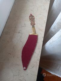 cedo un vecchio antico vintage tagliacarte portafortuna detto" del Benessere" forgiato in ottone, di origine indiana , della setta religiosa dei VAISHNAVA, devoti del dio. Di inizio XX secolo. Oggetto ancora in ottime condizioni dato il suo tipo di uso. Ha forma a scimitarra con impugnatura rappresentante il dio Vishnu, uno degli dei indù.lama ovviamente solo per solo uso taglia carte o apri lettera o apri busta : non è un pugnaletto anche lo potrebbe sembrare. provenienza lecita collezione personale.