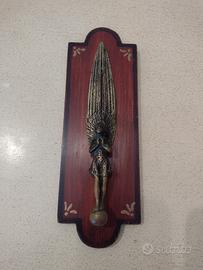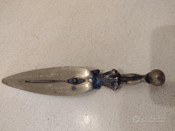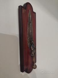 Antico tagliacarte decorativo in bronzo su recente supporto in legno dipinto