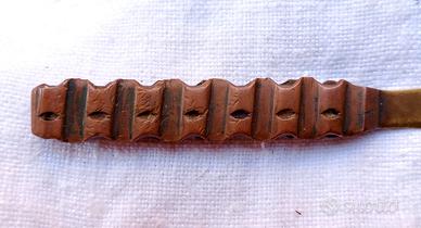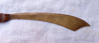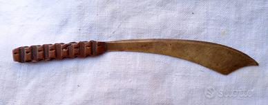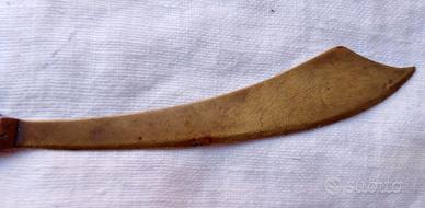 Tagliacarte d'epoca fascista degli anni '30. Il cimelio in argomento è stato realizzato con impugnatura a forma di frammento di “bomba a mano” coeva tipo “SIPE” in lega di rame, mentre il tagliente stile “scimitarra”. L'affascinante "FONTE MATERIALE" del Ventennio fascista italiano si presenta in “OTTIME" condizioni di conservazione, "genuino" ed "intonso" senza ne mancanza, rottura e/o difetto alcuno. Misure: lunghezza complessiva = 170 mm; solo tagliente = 110 mm.