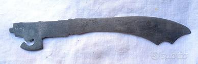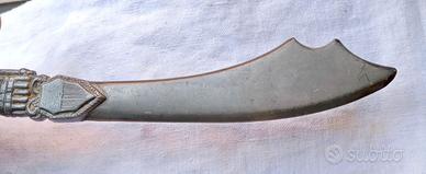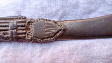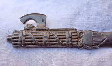 Tagliacarte d'epoca fascista degli anni '30. Il cimelio in argomento è stato realizzato in metallo autarchico (pesante) argentato con impugnatura a forma di fascio littorio e tagliente a forma di scimitarra. L'affascinante "FONTE MATERIALE" del Ventennio fascista italiano si presenta in “OTTIME" condizioni di conservazione, "genuino" ed "intonso" senza ne mancanza, rottura e/o difetto alcuno. Misure: lunghezza complessiva = 235 mm; solo tagliente = 150 mm.
