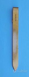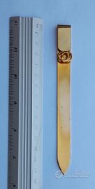Tagliacarte segnalibro vintage (fine anni '80) in ottone con logo GG sulla clip. Scritta "GUCCI MADE IN ITALY" incisa sul retro. Lunghezza: 14,3 cm - Larghezza: 1,3 cm. Lievi segni d'usura e sbiadimento nella parte centrale della lama a causa dell'invecchiamento. Accessori: confezione originale + custodia in PU unbranded