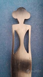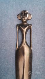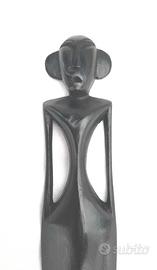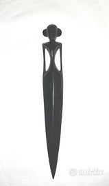Tagliacarte artigianale proveniente da Lombok (Indonesia), realizzato a mano in ebano. La lavorazione è estremamente fine ed elegante, con una forma slanciata e un manico intagliato a figura stilizzata.