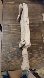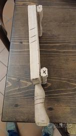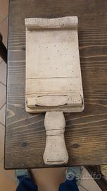Tagliere in legno vintage o un utensile da cucina d'epoca, caratterizzato da un manico sagomato e segni di usura, inclusi piccoli fori sulla superficie. Materiale: Legno massello. Caratteristiche: Manico integrale intagliato e foro per appenderlo. Dimensioni: La lunghezza totale è di circa 36 cm, misurata con un metro da sarto in legno a fianco. Manutenzione: Si consiglia il lavaggio a mano con acqua e sapone, evitando di immergerlo, e l'asciugatura in verticale all'ombra.