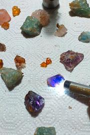 Gemme grezze visionati e guardati attentamente con LASER lente , purezza e piccole sfaccettature all'interno delle gemme come : Giadite imperiale, Topazio imperiale rosso fuoco rum" - bruno arancione , Citrino imperiale giallo limpidi molto belle e pregiate, compreso ( quarzi interessanti come : Ametista viola blu elettrico "ottima qualità, quarzo fume', cristallo di roccia limpida etc.. ). Riepilogando abbiamo gemme grezze, ma lavorate si faranno ottimi gioielli.