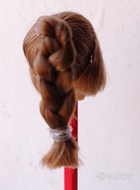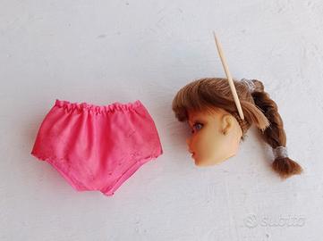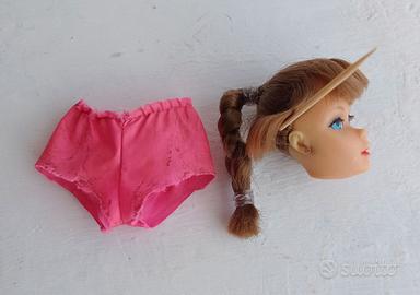Talking Barbie head #1115, vintage 1967 - "Go Go Co Co" - capelli con treccia laterale castano chiaro - fori per orecchini scoloriti - spaccatura sul collo - pantaloncini originali in vinile rosa acceso, sfilacciati intorno alle gambe e con macchie scure.