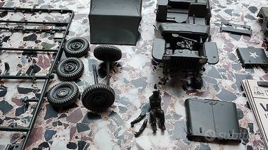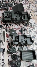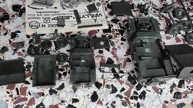 coppia di jeep Willys non complete più rimorchio e molti pezzi sciolti. Ideali per arricchire plastici oppure da inserire in scenari di guerra storici. Marca Tamiya e Italaeri
