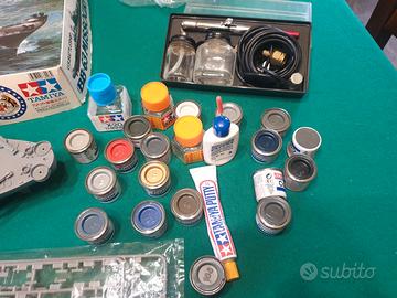 Modellino di nave da guerra americana, seconda guerra mondiale, già iniziata. Incluso kit da pittura con vernici mai aperte e aerografo mai usato.