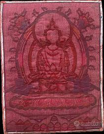 Questo tangka è un mix di dipinto rifinito con pezzetti di seta e tessuto di viscosa naturale