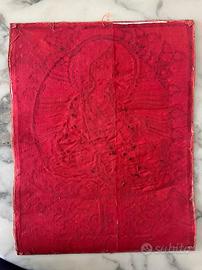 Questo tangka è un mix di dipinto rifinito con pezzetti di seta e tessuto di viscosa naturale