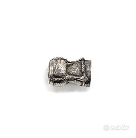 Oggetto decorativo vintage a forma di tappo da champagne, in metallo argentato, con incisione frontale “Auguri”.