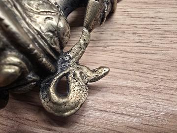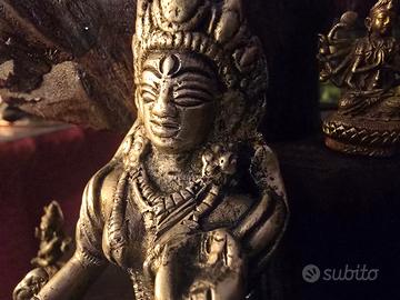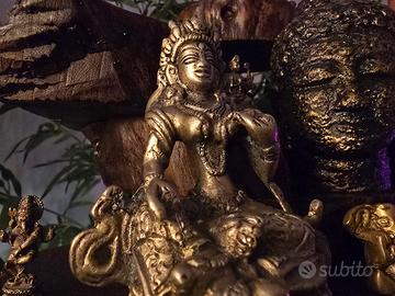 🧞♂️Al fine di venirvi incontro con il miglior prezzo possibile vi invito a dare un'occhiata anche agli altri articoli che ho attualmente in vendita. Splendida ed autentica raffigurazione di Tara Verde, realizzata con la tradizionale tecnica della fusione a cera persa tipica delle aree himalayane. La statua si presenta con una patina magnetica e una bellissima porosità della materia che ne attesta la lavorazione artigianale e non industriale. Il vero cuore di quest'opera è il suo fondello: una lastra in ottone battuta a mano e sigillata, che custodisce al suo interno i mantra di consacrazione. Questo dettaglio la rende una statua benedetta, un oggetto rituale "vivo" che porta con sé un'energia di protezione e pace. Le mani, poste nei mudra della generosità e dell'insegnamento, insieme ai drappeggi fluttuanti del vestito, donano alla figura una grazia straordinaria. Le dimensioni contenute (10 cm di altezza) sono un punto di forza eccezionale: oltre a impreziosire qualsiasi angolo della casa o un piccolo altare, permettono a chi la possiede di portarla agevolmente con sé. È la compagna ideale per chi viaggia o desidera avere un simbolo spirituale sempre a portata di mano, senza rinunciare alla qualità di una fusione artistica di pregio. Un oggetto dal design raffinato che fonde storia, arte e spiritualità in un unico pezzo da collezione. Dimensioni: 10 x 8 x 5 cm Peso: 323 grammi Consegna: Disponibile per consegna a mano a Reggio Emilia o spedizione sicura con TuttoSubito.
