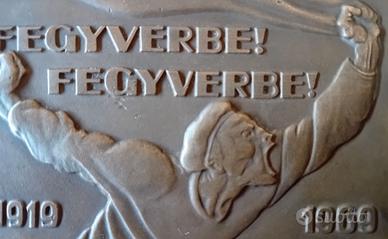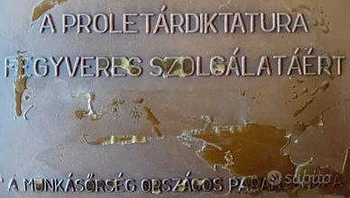 Targa raffigurante il famoso dipinto "Fegyverbe! Fegyverbe!" (Alle armi! Alle armi!) del 1919 di Róbert Berény, del partito comunista ungherese. Questa stessa immagine è stata poi riprodotta in decine di manifesto e poster ed è stata presa a pretesto per la realizzazone di una enorme statua per la città di Budapest (oggi questa statua è visibile e si trova al Memento Park di Budapest. Ho inserito la foto della statua). La targa è realizzata in bronzo o metallo bronzato e pesa 190 grammi. Dimensioni 10 x 7 cm. Sul retro vi è una iscrizione e si legge: "Per il serivizio armato della dittatura del proletariato. Comandante nazionale della Guardia del Lavoro (o dei Lavoratori)". Medaglia, targa molto rara. Provenienza Ugheria e come si legge è del 1969. Ottime condizioni anche se usato. Sul retro, come si vede dalle foto, vi sono macchie di colla che tuttavia sembra rimovibile. Oggetto molto raro e particolare.